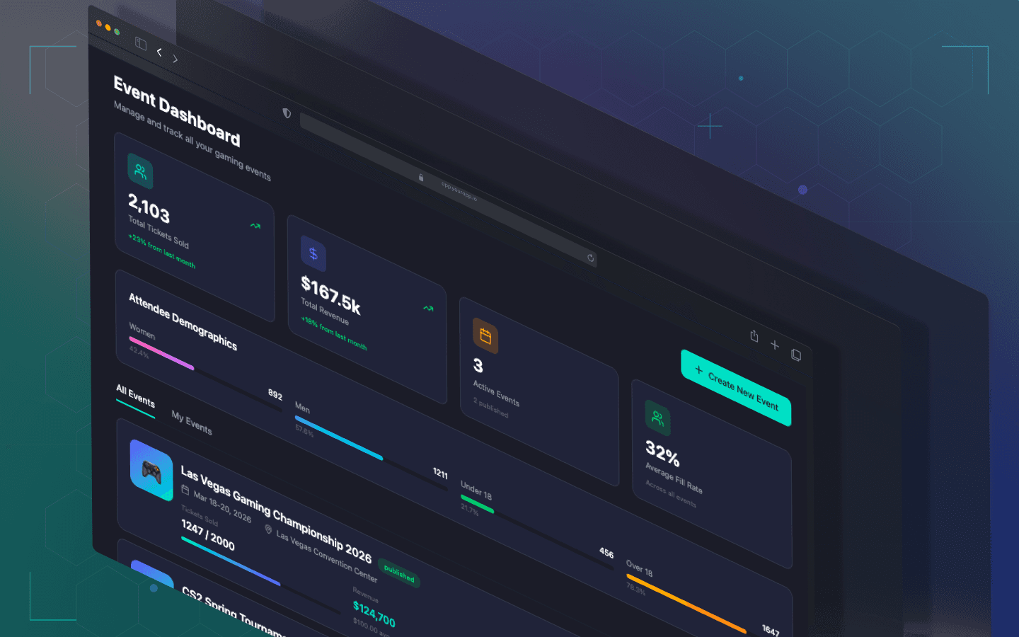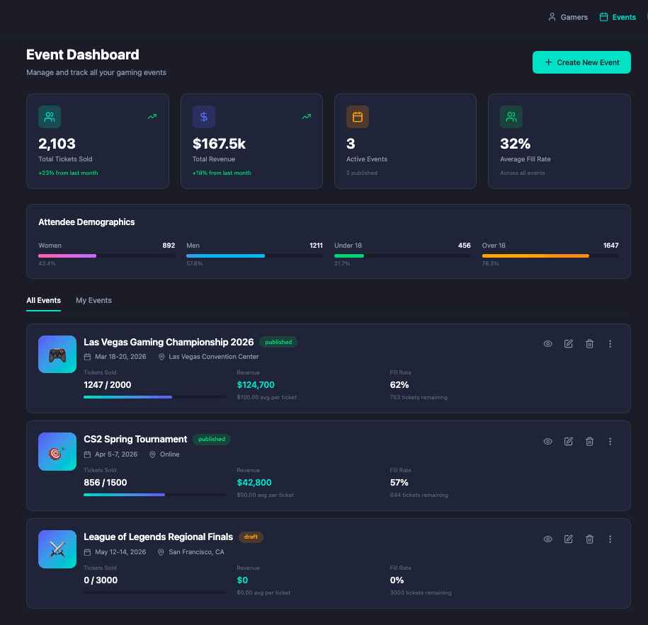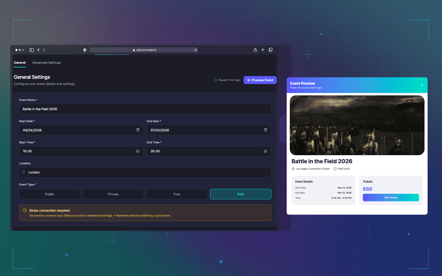 — the entry point. Event name, location, dates, capacity, description, logo, social links, terms. Required fields kept minimal and visually distinct from optional ones, with geo and dates prominently surfaced given their role in player discovery downstream.