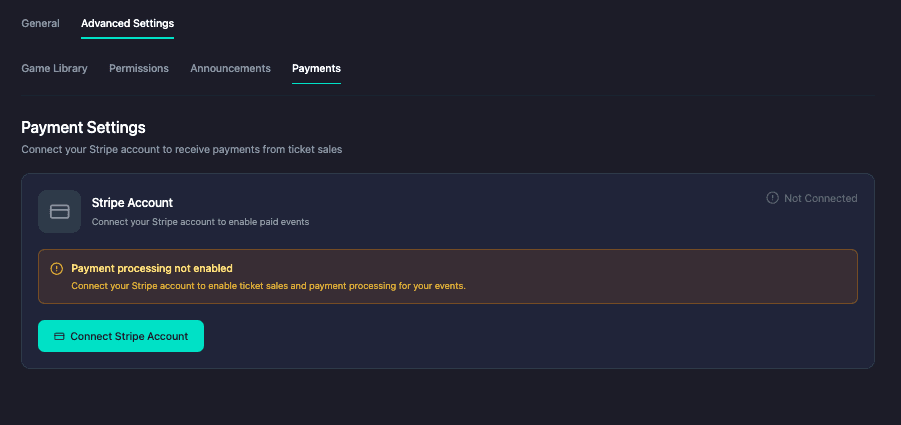 — the Stripe connection, placed deliberately last. Requiring financial setup as a gate to publishing kept early steps accessible while ensuring only committed organisers reached Publish — reducing incomplete test events cluttering the discovery feed.