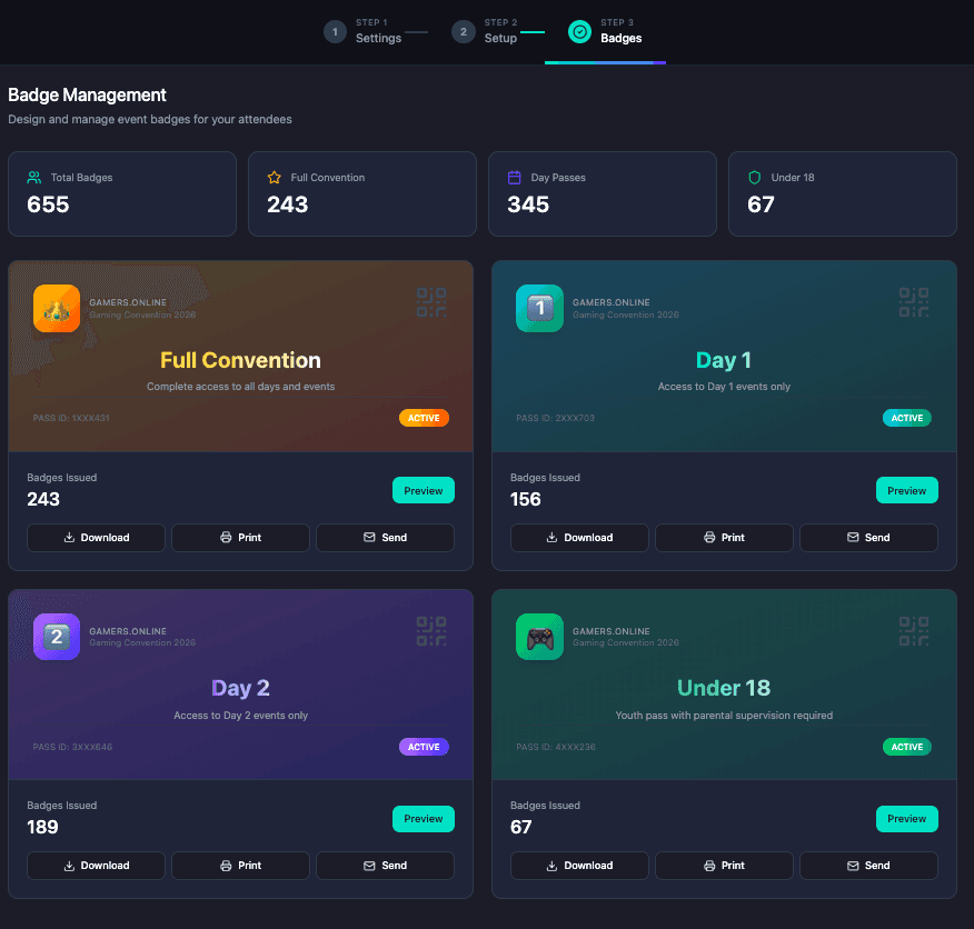 The event creation flow covered everything an organiser needed to set up a convention: basic details, multi-track scheduling, ticketing, role management, communications, and payments. Six sections, designed end-to-end, within a fixed design system I had no authority to change.