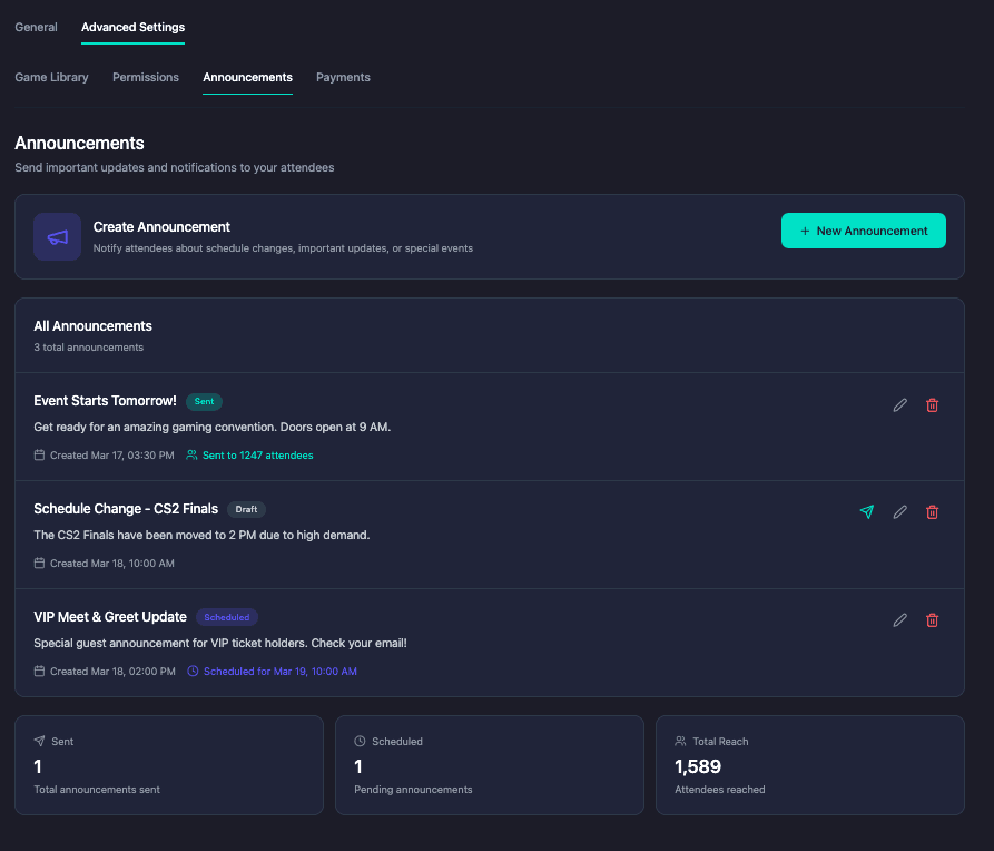— a direct messaging tool stripped to its essentials. Subject, audience, message, send. Designed for an organiser in the middle of running an event, not composing carefully from a desk.