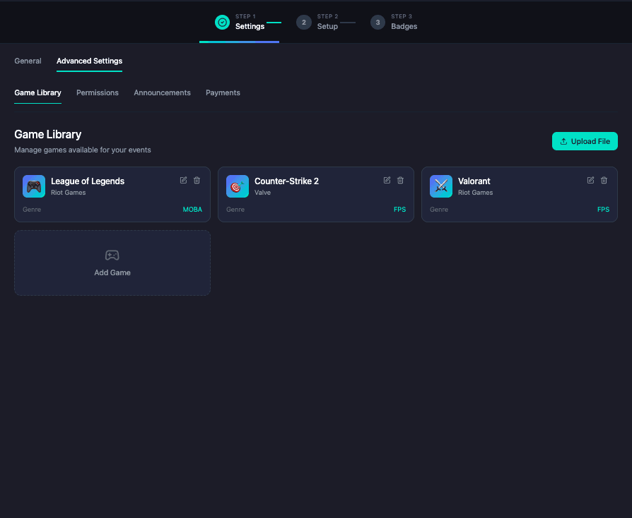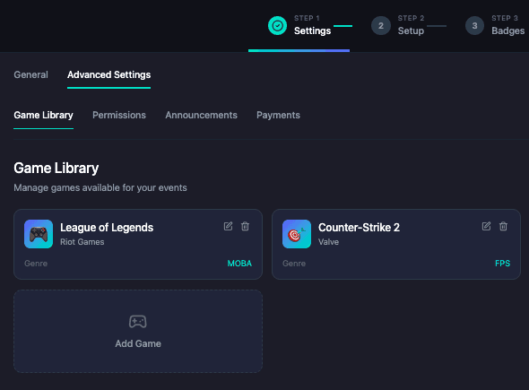 — the most complex section. Spaces, Tables, Game Library, Matches, and sub-events (workshops, seminars, tournaments). The Game Library integration let organisers pull directly from BoardGameGeek or the platform's own library — keeping the social layer useful rather than buried.