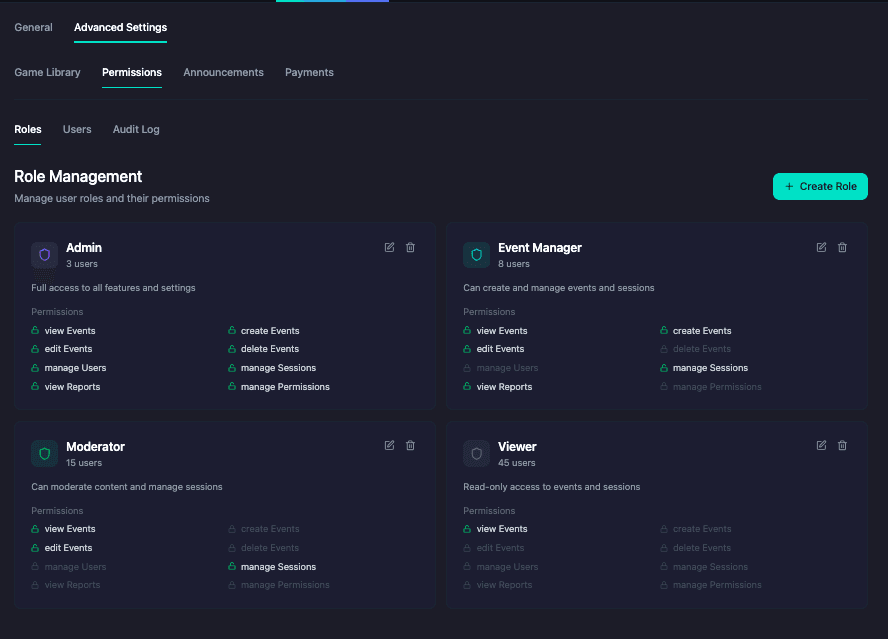 — granular role management for event staff across ten permission types, with automatic expiry at convention end. One detail that mattered: removing the overhead of manually revoking access after every event.