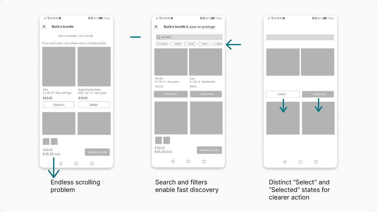 Endless scrolling with no way to find items — sellers with large wardrobes had to scroll indefinitely to find what they wanted to bundle. Fixed with a persistent search bar and category filters directly within the bundle flow.